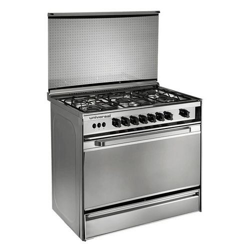 Universal طباخ غاز قائم، ستانلس ستيل، 5 شعلات، فرن مدمج، غطاء زجاجي, مروحة